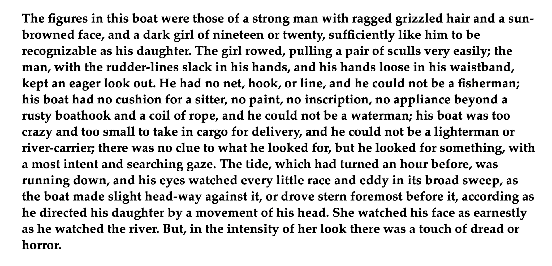 Skikkelserne i båden tilhørte en kraftig mand med tjavset, gråsprængt hår og solbrændt ansigt, og en mørk pige på nitten eller tyve som lignede ham tilstrækkeligt til at hun måtte være hans datter. Pigen roede med et par årer som hun håndterede med lethed. Manden, der holdt rorlinerne slæk i hænderne og hænderne løst i bæltet, spejdede ivrigt ud over floden. Han havde hverken net eller krog eller snøre og kunne ikke være fisker. Færgemand kunne han heller ikke være, for hans båd havde hverken pude til passagerer eller bemaling eller skilt eller grej ud over en rusten bådshage og et kvejl reb. Hans båd var for lille og sølle til fragt af varer, og han kunne ikke være lægtermand eller pramskipper. Det var umuligt at sige hvad det var han kiggede efter, men noget var det, og hans blik var ufravendt og søgende. Tidevandet, som var vendt en time forinden, var på vej ud, og hans blik fulgte hver eneste lille hvirvel og strømning i den brede flade, mens båden arbejdede sig møjsommeligt mod strømmen eller strøg af sted udad med agterenden forrest, alt efter hvad hans kast med hovedet dikterede datteren. Hun granskede hans ansigt lige så nøje som han granskede floden, men i hendes årvågne blik sås et strejf af frygt eller rædsel.